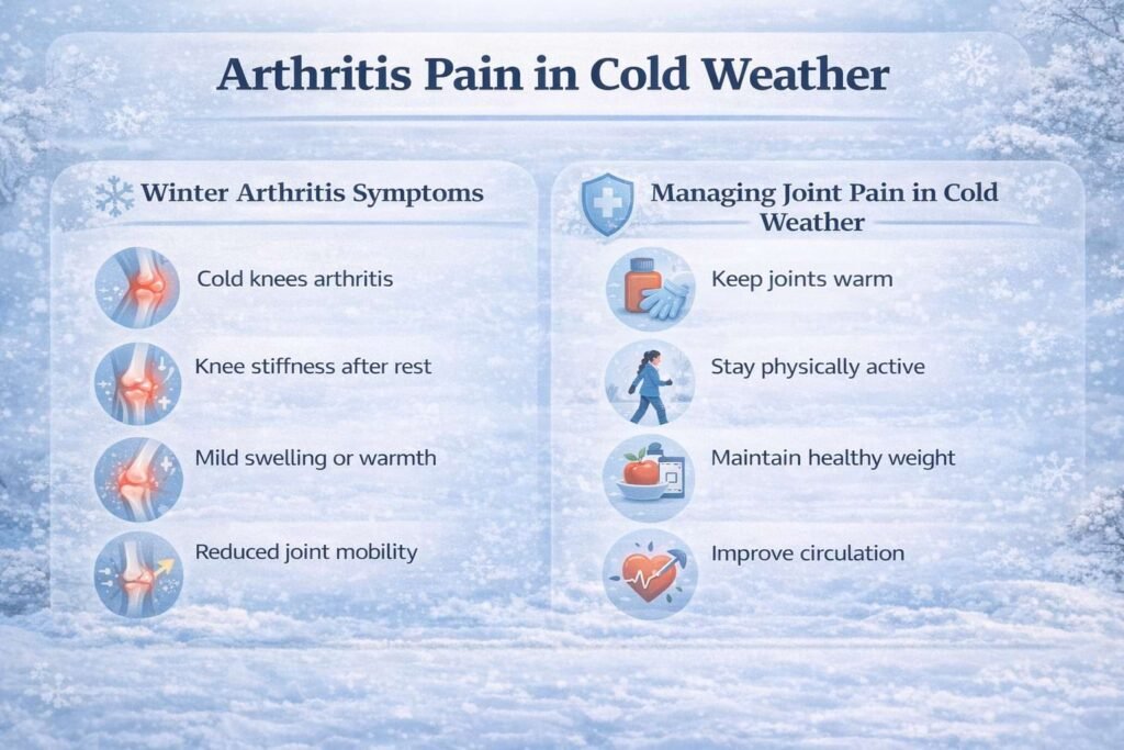 Arthritis pain in cold weather is a problem many people notice as soon as temperatures drop. Joints that felt manageable during summer can suddenly become stiff, swollen, and uncomfortable in winter. Doctors often hear patients say their knees or fingers seem to predict the weather better than the forecast.